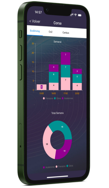 A través de este panel través de nuestra aplicación GPS podrás ver la cantidad de emisiones de CO2 que produce tu vehículo, pudiendo controlar hasta el máximo el nivel de eficiencia energética, además de reducir la huella de carbono del vehículo para proteger el medio ambiente.